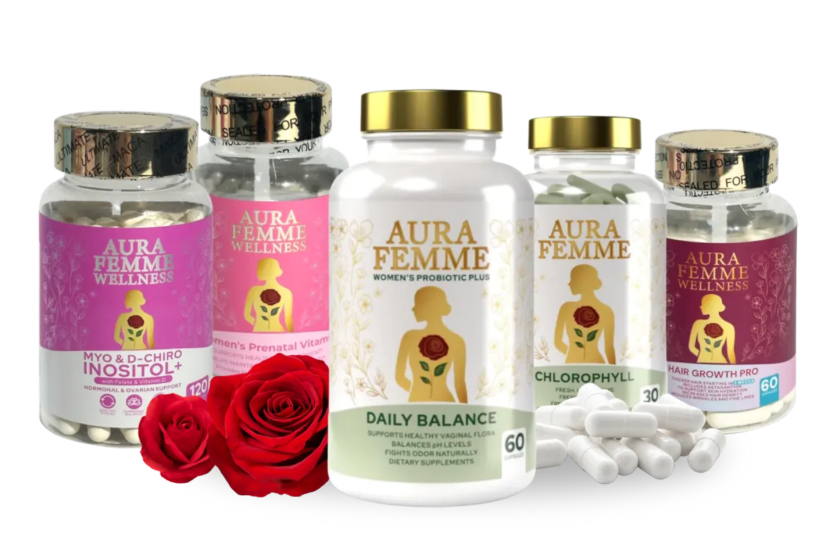 Aura Femme Wellness formulas blend premium, natural ingredients crafted to support feminine balance, and everyday confidence — from the inside out.